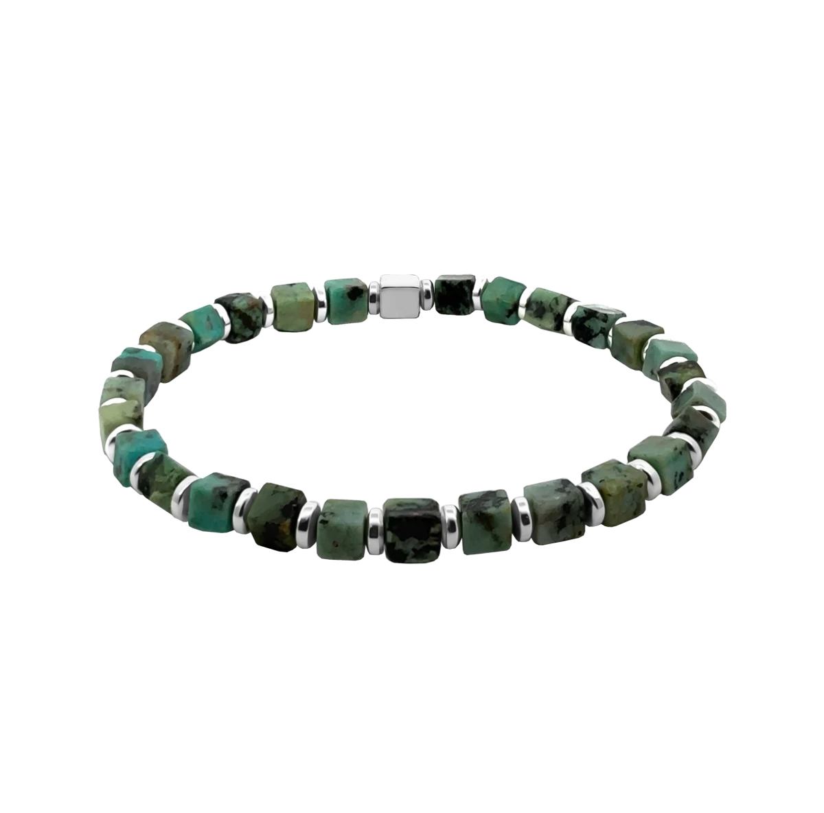 This tastefully designed men’s bracelet, made of small African turquoise cubes, hematite accents, and a prominent 925 silver cube, is not only a striking accessory but also carries the inspiring and protective power of African turquoise. African turquoise is believed to relieve stress, support inner balance, strengthen self-confidence, and boost personal courage – helping its wearer face each day with harmony, inner strength, and positive energy.