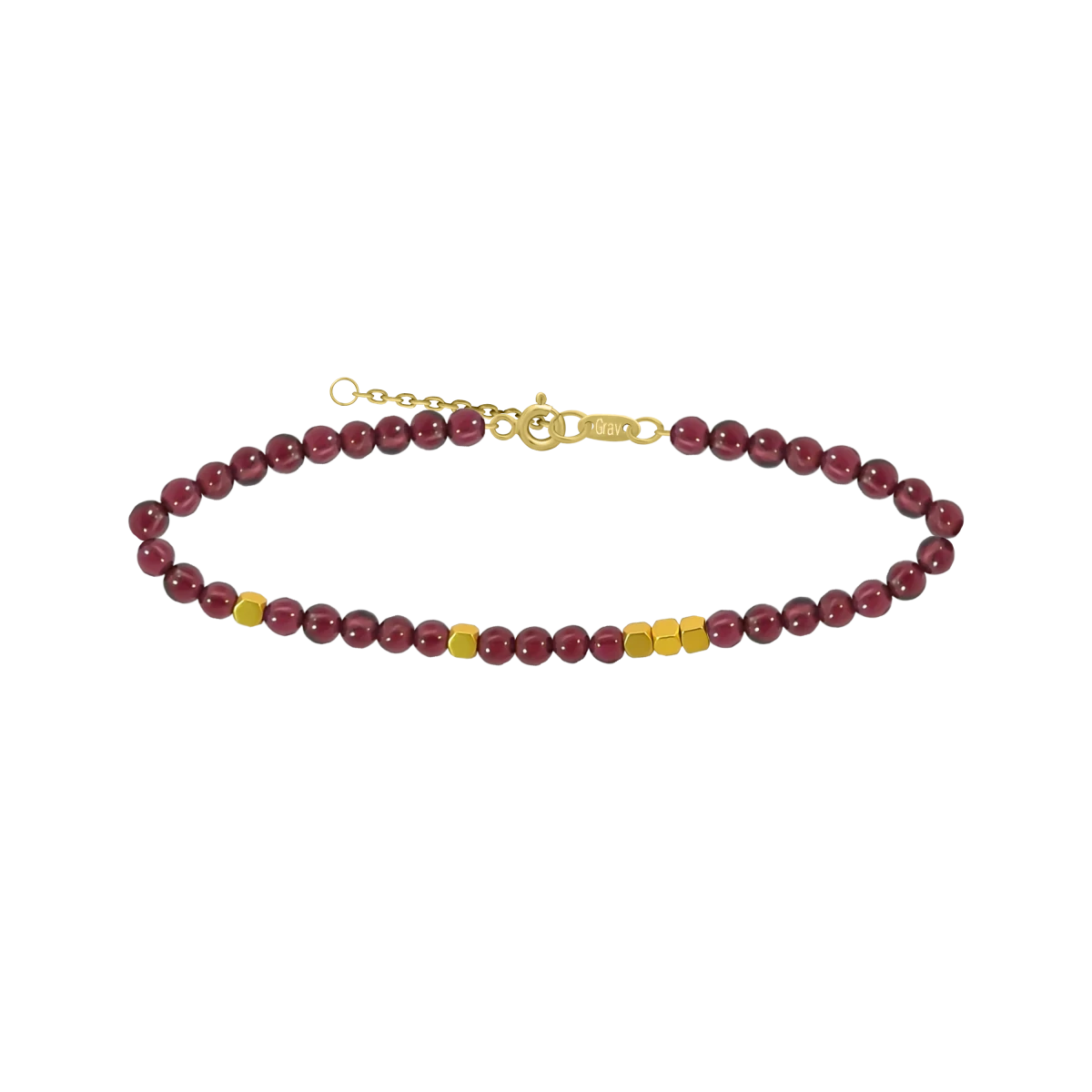 This handmade bracelet combines the richness of burgundy jade with the elegance of gold-colored hematite cubes, making it a perfect choice for those seeking festive sparkle. Burgundy jade is not only visually striking but is also believed by many to provide positive energy, harmony, and protection, making this bracelet a stylish and meaningful accessory. The delicate gold-plated hematite cubes add a luxurious touch, highlighting the deep tones of the burgundy jade. Thanks to the yellow gold-plated sterling silver extension chain, the bracelet can be easily adjusted for a comfortable fit on any occasion. This bracelet is an ideal choice for festive events, special occasions, and also makes a perfect gift for anyone looking for an elegant, energy-infused piece of jewelry.