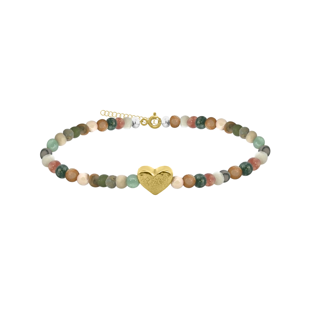Elegant, handcrafted gemstone bracelet featuring chalcedony, agate, quartz, marble, and calcite beads in warm autumn tones, perfectly complemented by a heart charm made of 925 sterling silver plated with yellow gold. The natural gemstones and the refined glow of the gold-toned heart create a timeless, feminine elegance. Thanks to its extender chain, the size is easily adjustable, ensuring a comfortable and precise fit.