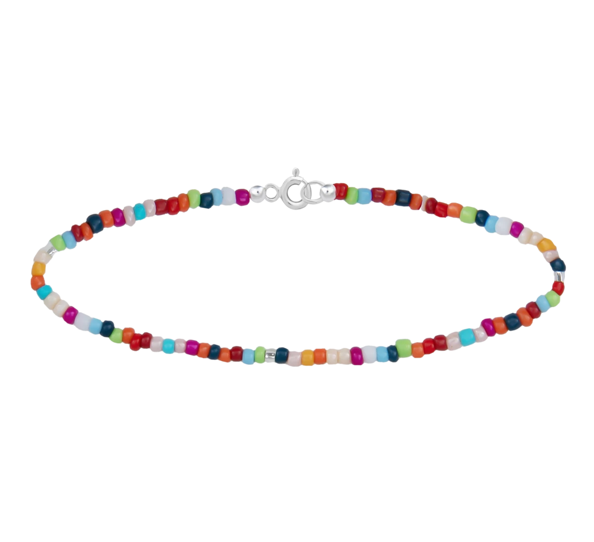 Designer ankle bracelet set with beads. This jewelry piece evokes a summer mood and brightens up any outfit with its cheerful style. The jewelry closes with a silver clasp that creates perfect harmony with the colors. Enhance your look with a colorful piece.
