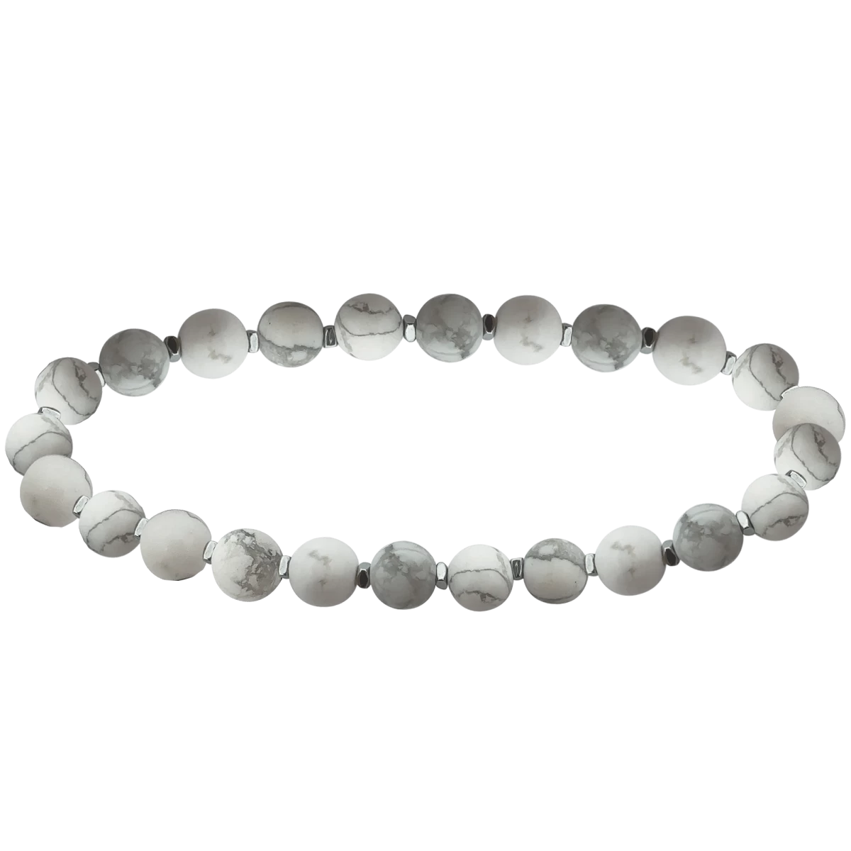 This special piece of jewelry is not just a fashionable choice, but also carries a special meaning, as the howlite stone radiates calmness and peace, while enhancing positive attributes and reducing stress. In addition, the silver elements between the howlite beads perfectly fit in, creating a harmonious and elegant overall effect for its wearer.