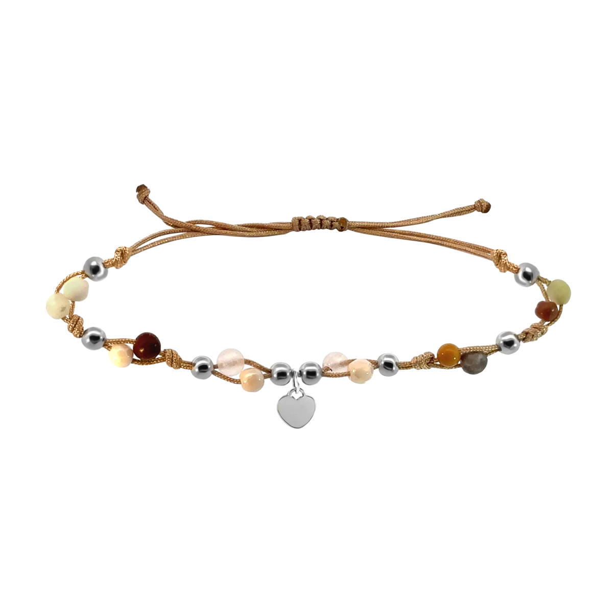 Step into the colors of nature with this unique anklet made with macramé technique, made truly special by colorful, genuine gemstone beads such as chalcedony, agate, quartz, marble, calcite, and a small dangle heart charm. Every detail of the anklet is crafted with careful handwork, and the tear resistant thread not only ensures comfortable wear but also withstands active, dynamic everyday life.