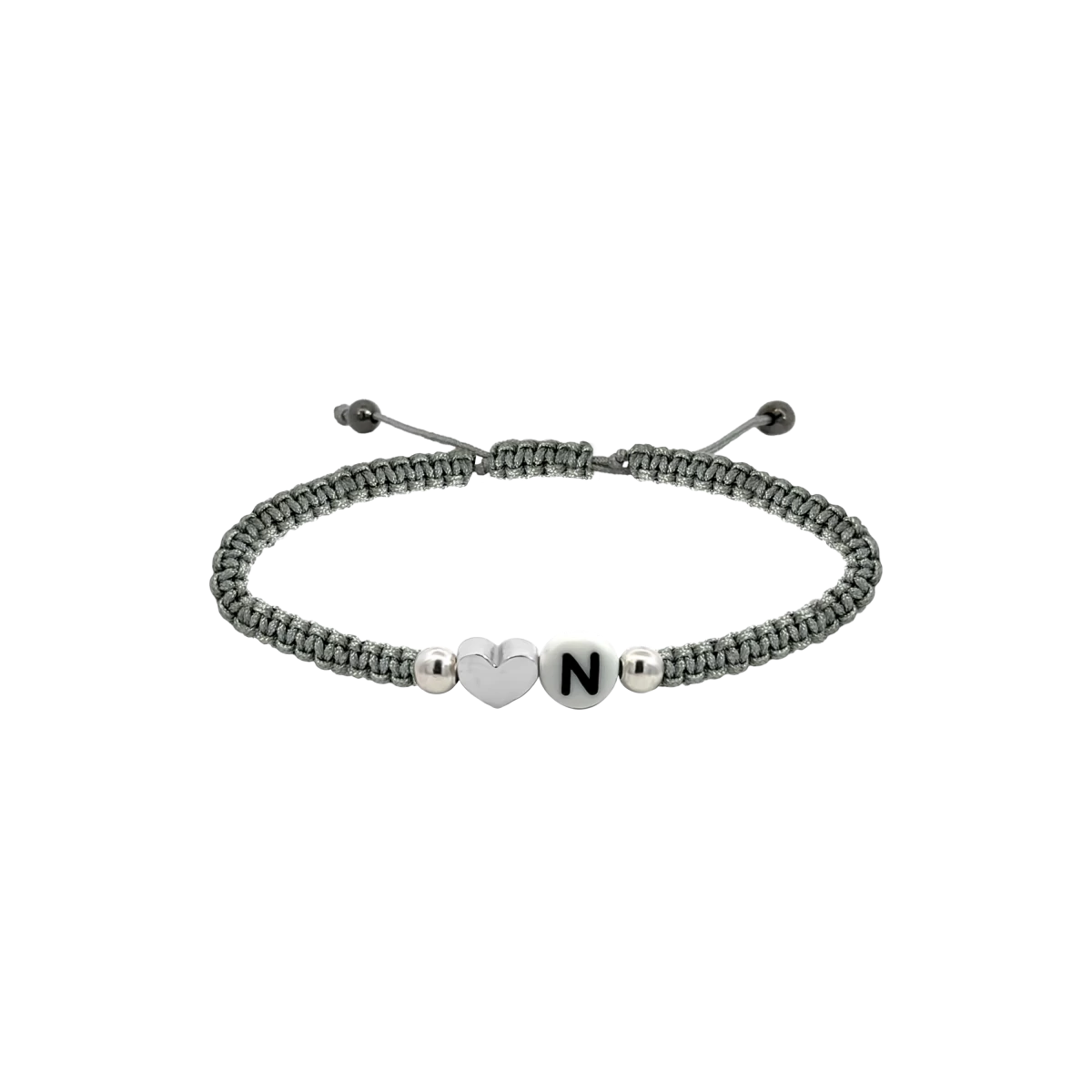 Choose the exceptionally high-quality, tear-resistant thread macramé bracelet, made unique by meticulous craftsmanship and enriched with decorative elements including a silver heart, acrylic letter, and two silver beads.