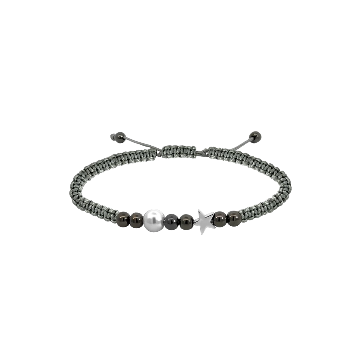 This bracelet made with macramé technique is not only made from durable, tear resistant thread, but also gives its wearer a unique look, made truly special by the hematite star placed in the center and the six onyx beads, while the single silver bead shines with a discreet yet elegant glow.
