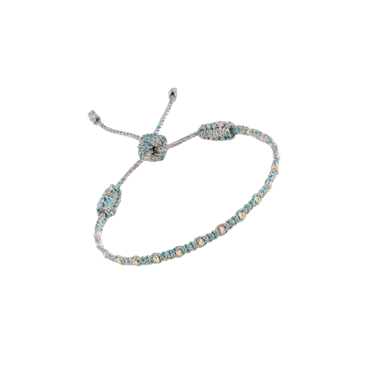Discover the magic of the Maya Luna bracelet, where delicate peach and romantic blue threads are beautifully woven together in perfect harmony. The colors evoke a warm Mediterranean vibe, while the 18k gold-plated beads add a playful sparkle that lights up the wrist. The intricate details of the traditional weaving technique bring a touch of modern summer freshness and effortless elegance. Wear the Maya Luna bracelet to add a pop of color and joy to your everyday looks, or pair it with chic outfits to highlight the feminine, radiant spirit of summer!
