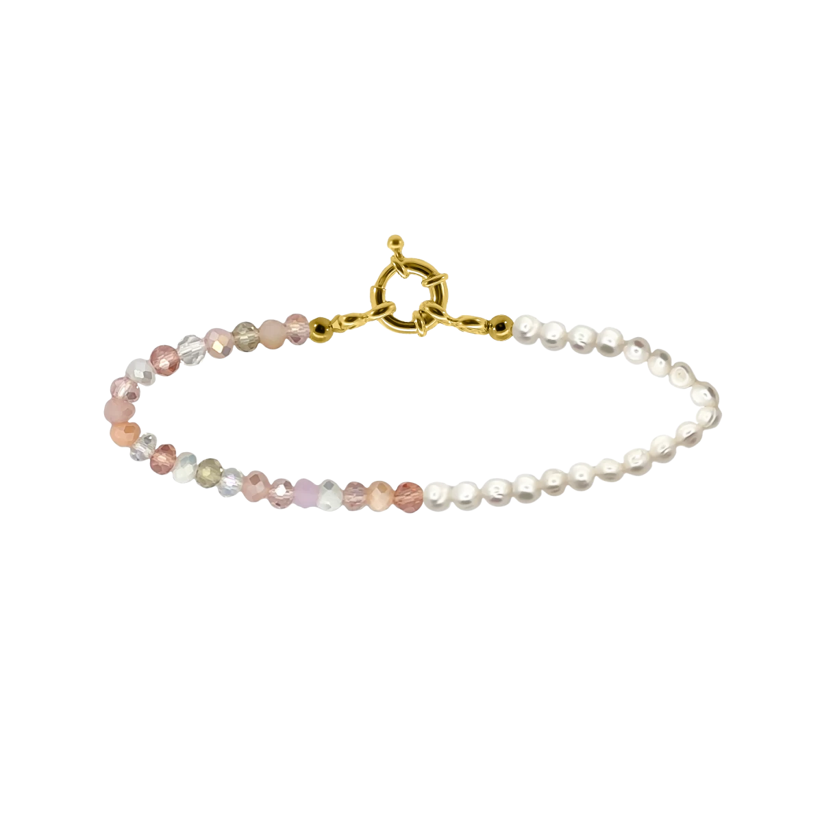 A captivating bracelet that embodies the fusion of prestige and modern fashion, featuring the delicacy of pearls intertwined with the sparkling play of pink and white crystals, all elevated by an exceptionally unique 18-carat yellow gold-plated 925 sterling silver clasp.