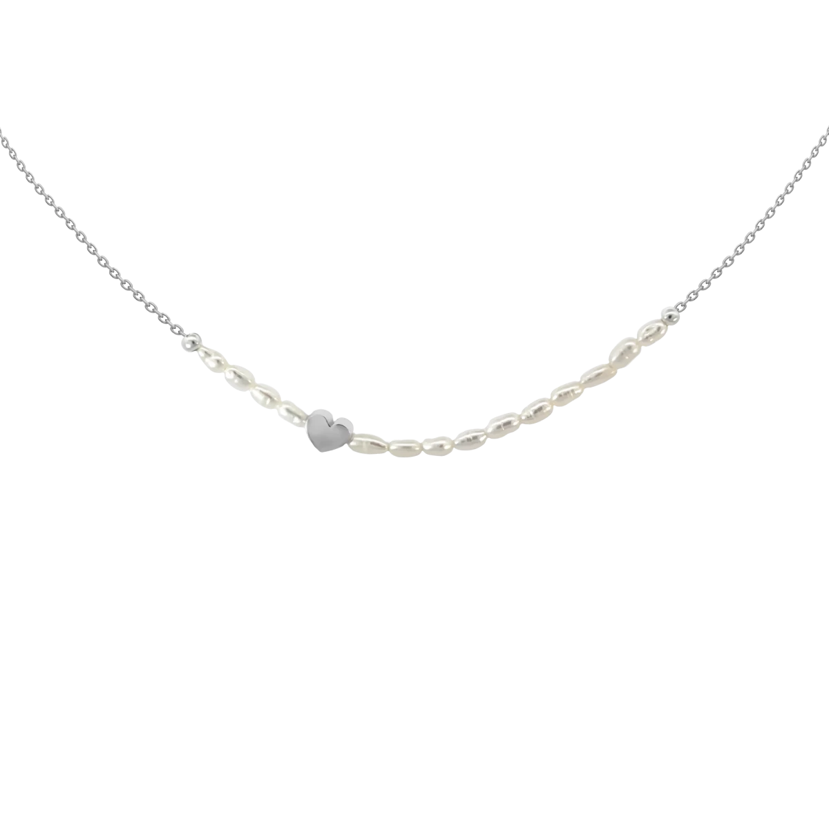 Discover the perfect harmony of femininity and emotional sophistication with this summer necklace, featuring rice-shaped white freshwater pearls and a delicate anchor chain – where classic meets modern style! The silver heart pendant placed at the center is not only a striking design element, but also a symbol of pure elegance, love, connection, and inner balance.