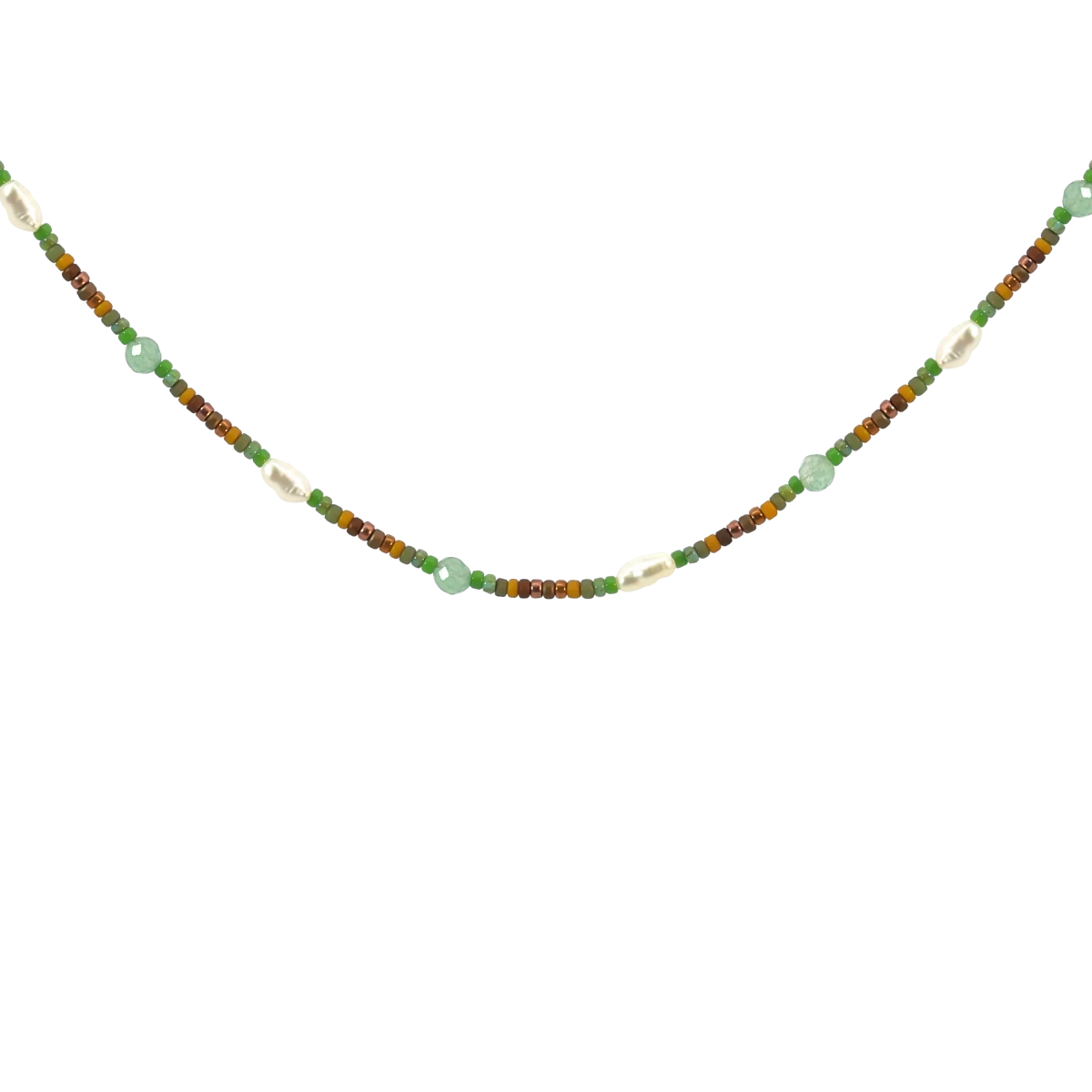 Natural elegance in shades of brown and green. This handmade necklace is the perfect combination of festive sparkle and natural harmony. In addition to the dominant green design beads, it is adorned with delicate seed beads in warm brown tones, giving the piece a richer, more celebratory feel. The unique shine of the green aventurine adds a fresh yet refined look, while many consider this stone a symbol of harmony, luck, and positive energy – making the bracelet not only beautiful but also meaningful. The snow-white rice pearls create a stunning contrast with the green and brown hues, further enhancing the necklace’s elegance. Thanks to the practical extension chain, it can be easily adjusted to fit, ensuring comfortable wear both for everyday use and special occasions.