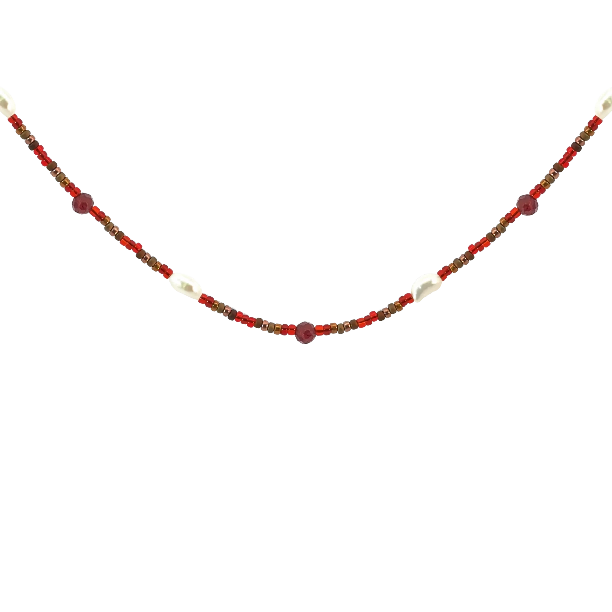 This handmade necklace is where feminine elegance meets modern, festive charm. The sparkling red–burgundy seed beads immediately catch the eye, and their warm tones perfectly harmonize with the deep red garnet stones. Garnet is widely regarded as a stone of strength, passion, and protection, making this piece not only visually stunning but also a source of energy and confidence. The delicately incorporated white rice beads create a fresh, clean contrast to the burgundy tones, highlighting the necklace’s elegance and femininity. Thanks to the practical extension chain, it can be easily adjusted to fit, ensuring comfortable wear for everyday occasions, while also making it an ideal choice for festive events, the winter season, or as a special gift.