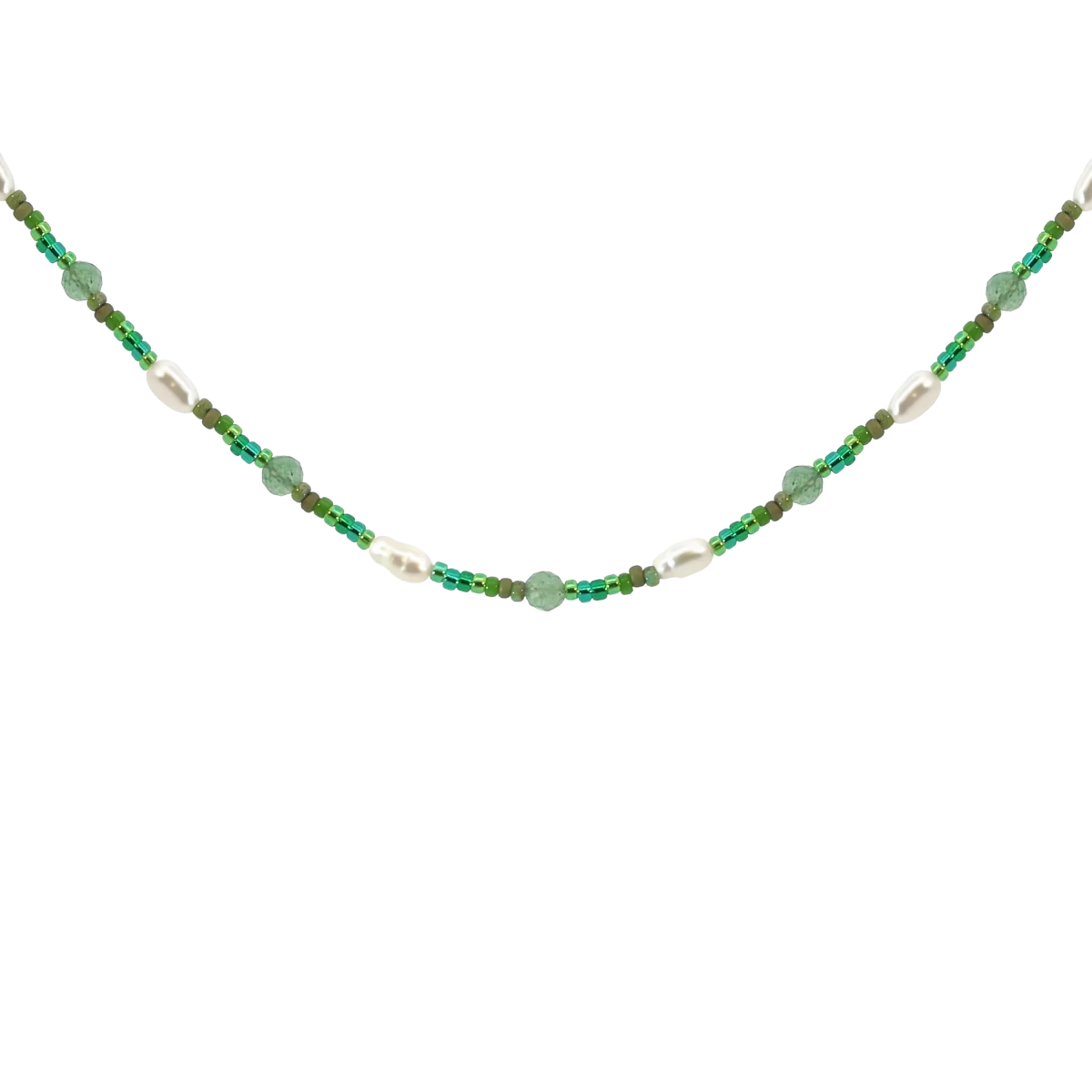 This necklace radiates a festive glow thanks to the dominant green design beads and the shimmering green aventurine, creating a fresh yet refined appearance. Aventurine is often considered the stone of harmony, luck, and positive energy, adding a special meaning to this unique piece of jewelry. The delicate white rice-shaped pearls create a beautiful contrast with the green tones, making the necklace even more elegant.