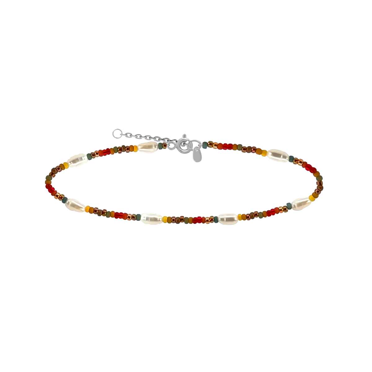 The colors of nature on your wrist. Discover the magic of autumn with this youthful and vibrant bracelet inspired by the warm tones of the season! The carefully selected design beads – shimmering in golden brown, soft yellow, and reddish hues – blend harmoniously with delicate, rice-shaped white freshwater pearls, evoking the colors of falling leaves and sunlit nature. This bracelet is not only elegant and naturally beautiful but also practical – with its adjustable chain extender, it ensures a perfect and comfortable fit every time.