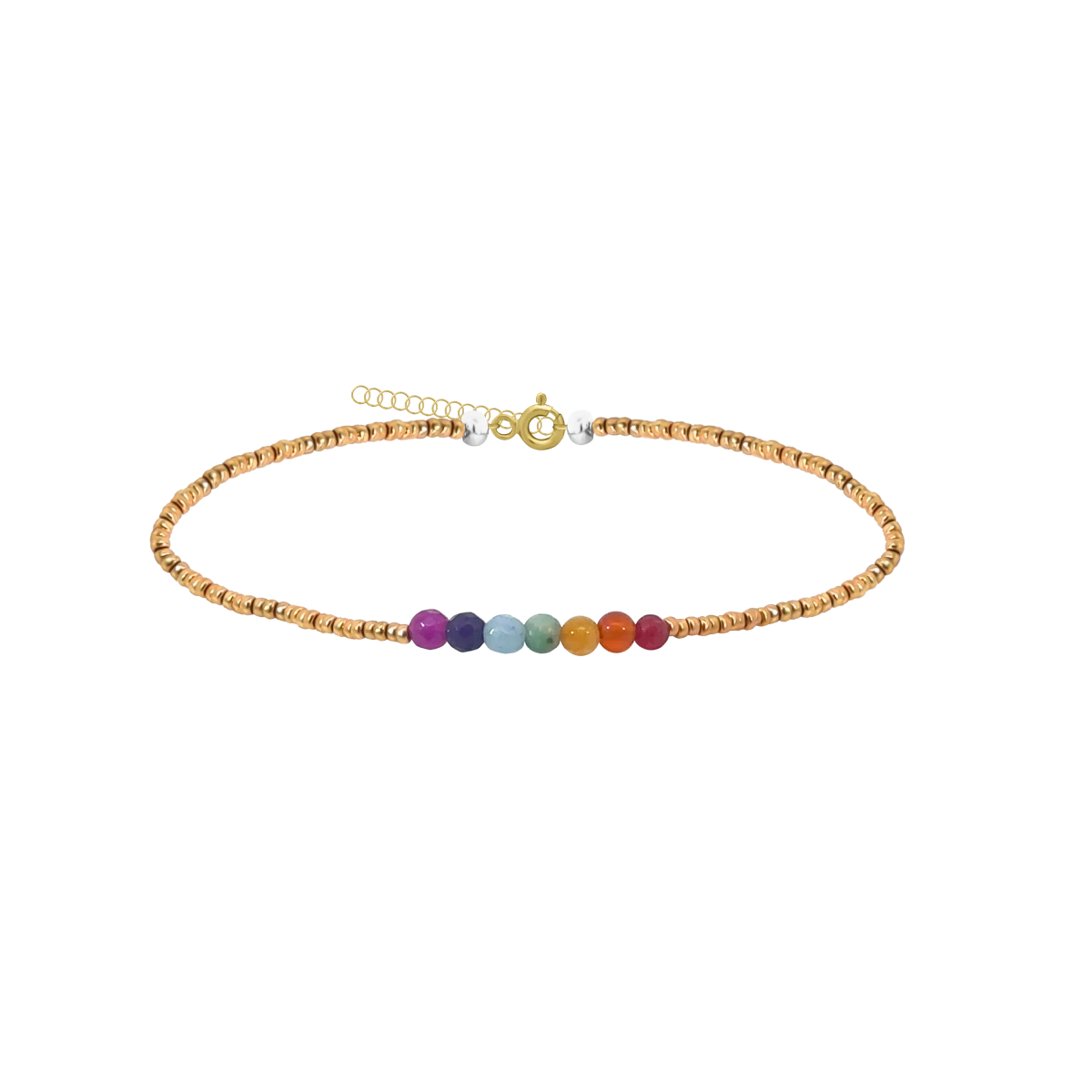 Elegant, handcrafted chakra bracelet featuring gemstones in the colors of the 7 chakras and gold-colored design beads, helping to harmonize energy and support inner balance. This spiritually inspired crystal bracelet is not only a unique piece of jewelry, but also a stylish accessory for a conscious lifestyle. Thanks to its yellow gold plated silver extender chain, the size is adjustable, making it comfortable for everyday wear and an ideal gift as well.