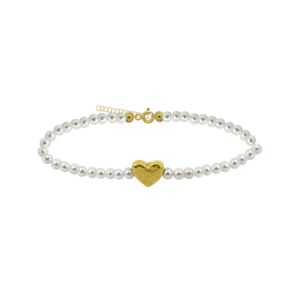 Elegant, handcrafted pearl bracelet made of small, delicately shimmering pearls, perfectly complemented by a heart charm crafted from 925 sterling silver and plated with yellow gold. The timeless elegance of the pearls and the warm glow of the gold-toned heart create a refined, feminine look. Thanks to its extender chain, the size can be easily adjusted for a comfortable and precise fit.