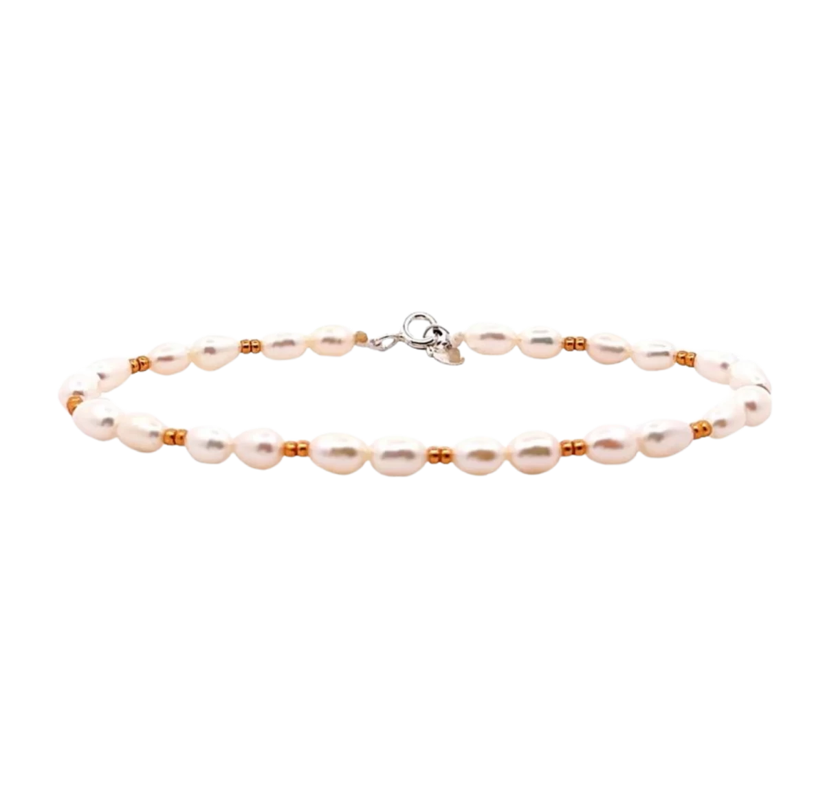 White Freshwater Pearl and Yellow Gold Seed Beads Silver 925 Bracelet