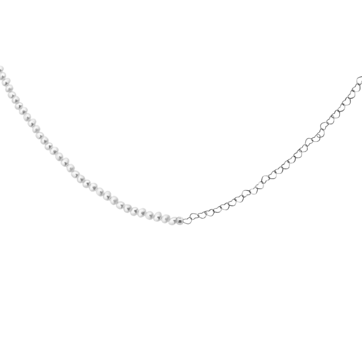 Beautifully crafted, elegant necklace made of heart-shaped silver chain links and white pearls, designed according to the latest trends. The size of the heart patterned chain links is 4 x 3.5 mm. Find the matching bracelet in our selection.